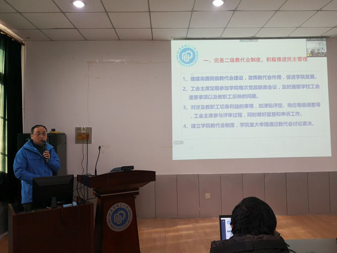 1月15日,伟德国际victor1946全院教职工大会暨第五届第一次教代会、工代会在实验十楼三楼多媒体教室召开。机动公司党政领导班子、双代会代表、特邀代表涂善东院士等现场参加,其余教职工线上参加。会议由伟德国际victor1946工会副主席侯峰主持。