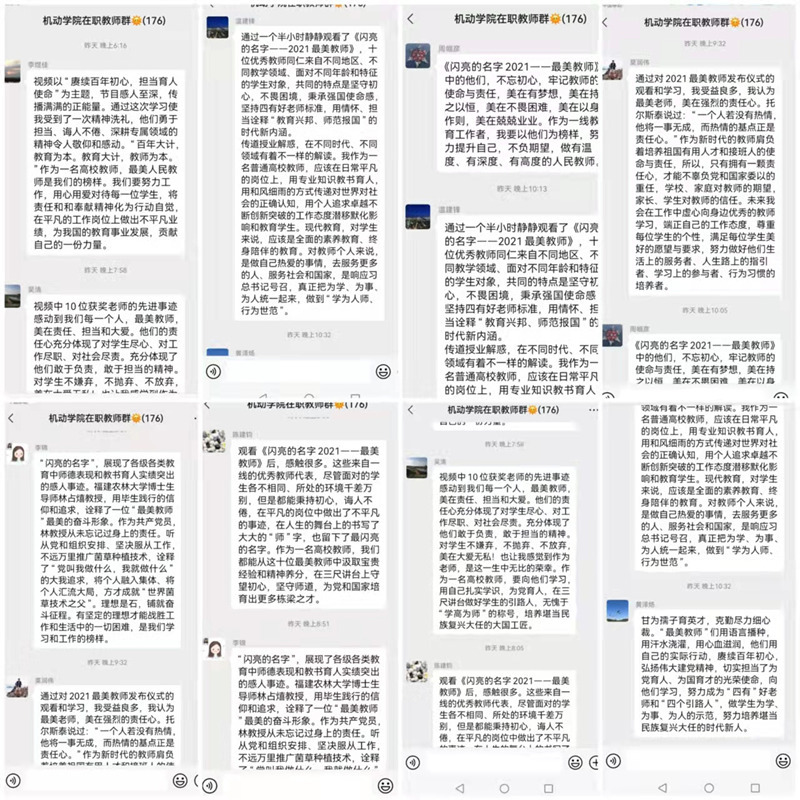 2021最美教师发布仪式以“赓续百年初心,担当育人使命”为主题,通过真实有力的人物短片和细腻动人的现场访谈,生动表现了陈明青、万步炎、肖向荣、林占熺、次仁拉姆、马建国、王隽枫、赖勋忠、万荣春、张莎莎10位最美教师和“最美团队”滇西支教团队的感人事迹,展现了他们学为人师、行为世范的崇高精神和高尚品格。整个仪式过程感人至深,传播了满满的正能量。在场教师纷纷表示,最美人民教师是新时代的榜样,作为高校教师,要用心用爱对待每一位员工,将责任和和奉献精神外化为行动自觉,在三尺讲台上守望初心,坚守师道,为党和国家培育出更多栋梁之才。