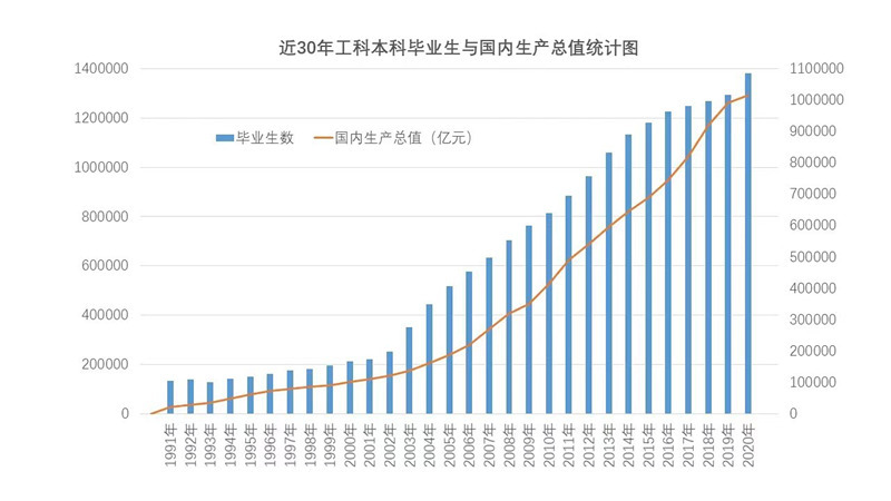 图3:近三十年工科本科毕业生与国内生产总值统计图