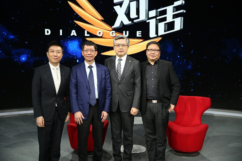 左一:《对话》栏目主持人陈伟鸿;左二:涂善东教授;左三:世界工程组织联合会主席龚克;右一:资深媒体人吴伯凡)