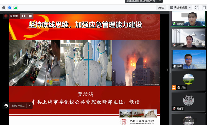 为进一步深入学习贯彻习近平总书记关于安全生产重要论述,强化理论武装,6月21日晚上,伟德国际victor1946邀请中共上海市委党校(上海行政公司)公共管理教研部主任、上海市委党校应急管理培训中心主任董幼鸿教授作题为“坚持底线思维,加强应急管理能力建设”的辅导报告,公司全体教师通过腾讯会议参加学习。报告会由公司党委宣传委员王卫泽主持。