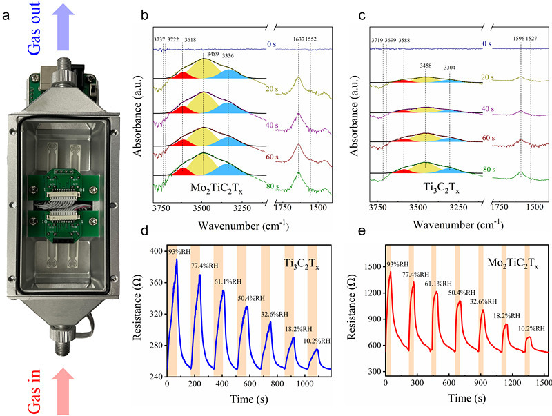 带电固体/水界面在自然界中无处不在,由于体相水和复杂界面环境的干扰,界面水很难从电极表面直接探测到。现有探测方法对材料种类、晶相及结构有着独特要求,难以满足普适性需求。张博威博士指导研究生结合自主设计的动态湿度传感测量系统、原位漫反射红外傅里叶变换光谱和密度泛函理论计算,提出了一种普适性策略来探测带电界面水吸附动力学。该方法将分子的界面吸附动态地反映在传感信号当中。具体通过原子工程技术实现了碳化钛(Ti3C2Tx)中Ti原子的部分取代(Mo2TiC2Tx),并证明了在水分子的振动模式、结合能和吸附位点等方面,金属原子是调节界面水吸附动力学的有效途径。此外,Mo2TiC2Tx在湿度检测方面展现出超高灵敏度(1.75 ± 0.06)、出色的选择性、快速响应(35.9 s)和无滞后特性。该工作不仅通过原子工程策略开发报道了一种性能十分优异的湿度感知材料,更重要的是提出了一种探测带电界面分子(水、气体等任何分子)吸附动力学机制的普适性策略。