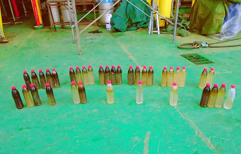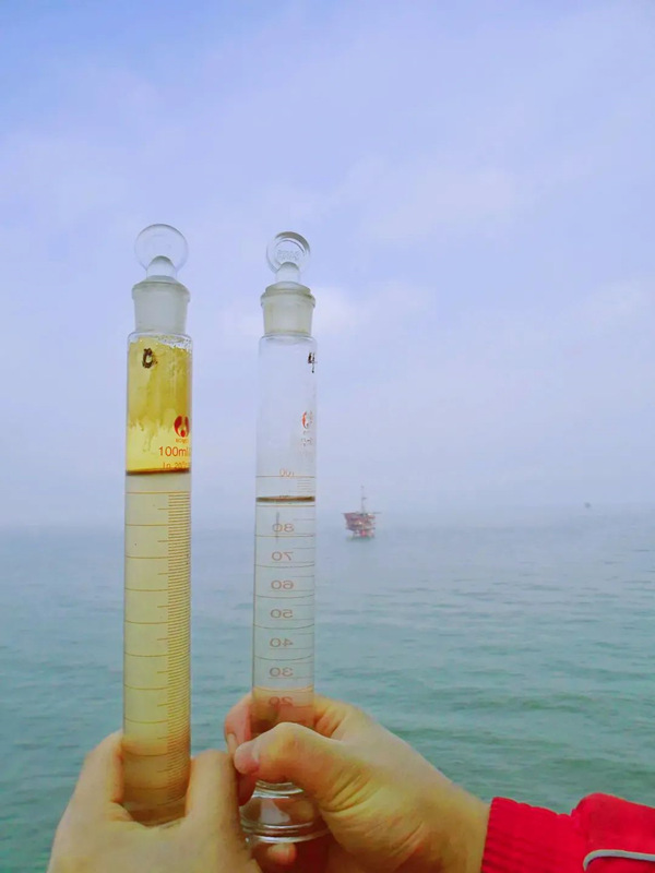 一去平台,就是将近一个月的“与世隔绝”,这是杨强教授团队每位成员都经历过的“海上故事”。无论是初期调研、侧线试验、开工调试,还是效果标定,都离不开参数的调整和取样、测试。团队成员登上平台便进入“战时状态”,要连续30多天从不同的位点取样。样品测试需要经过降温、萃取、沉降、过滤等复杂流程,最多的时候,一天要对40余个各种不同类型的水样进行测试。