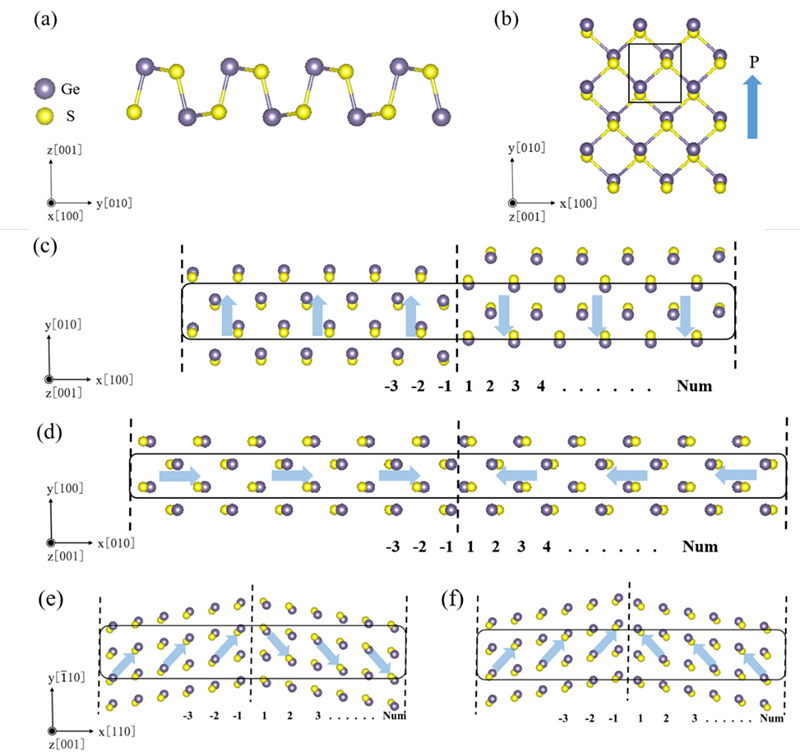 图1. 二维GeS的原子结构以及180°和90°畴壁结构图