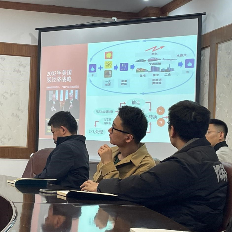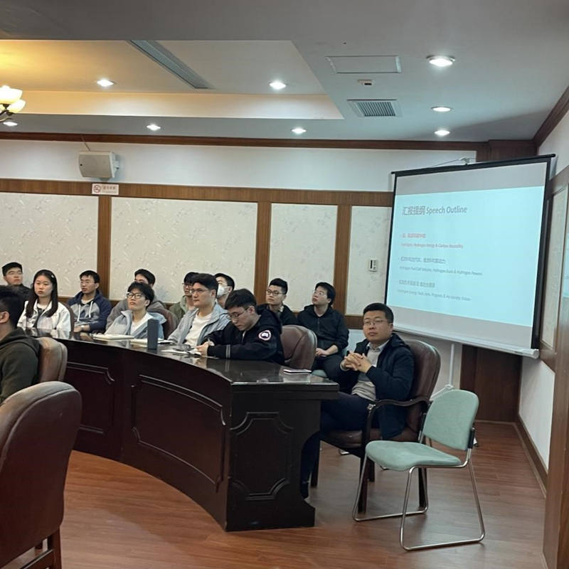 明平文教授以氢、氢能和碳中和引入本次讲座的主题。他以时间轴为主线,回顾了近几十年来各国在氢能经济上做出的重大推动。他重点介绍了我国氢燃料电池汽车的创新之路。他提出,不同的动力终端对燃料的需求和定义不同,对于载运工具而言,车载氢密度是至关重要的挑战,他认为基于绿氢设定的合成氢燃料有较大的发展潜力。最后,他对氢能技术规划和社会需求进行了展望。此次讲座展现了明教授对我国能源的发展历程和未来趋势深刻的见解与独到的分析,开阔了公司师生的视野,丰富了校园文化生活,营造了良好的学术氛围。