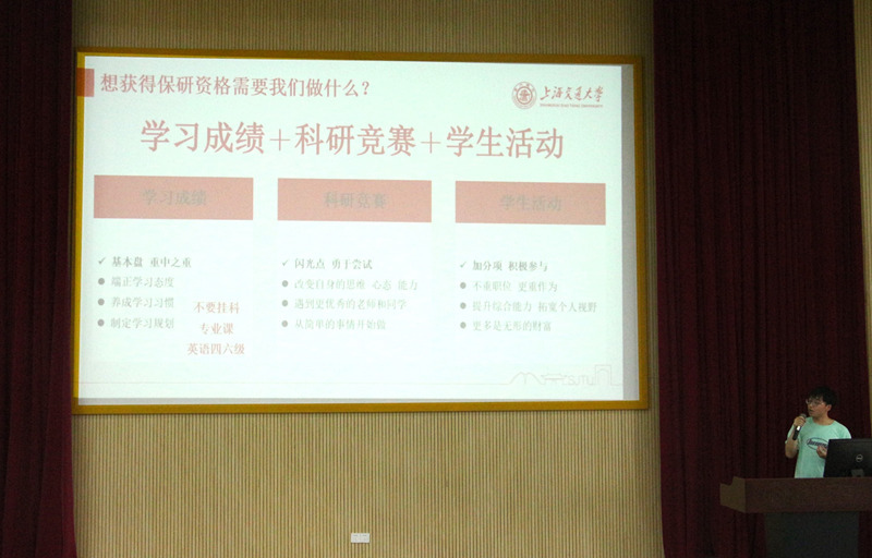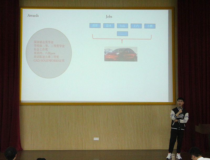 郑浩南现作为直博生就读于上海交通大学,蔡炜春现就职于特斯拉(上海)有限公司,两位优秀员工都以自身的成长经历,向同学们展示该如何规划未来的发展、做好当下的学习。郑浩南结合学习经历分享了为什么要读研,读研需要哪些品质,在大学期间如何以保研的目标提高自己。蔡炜春分享了自己的求职经历,以头脑风暴的形式发动同学们对自身职业规划的思考,并解读了大学期间的时间安排。