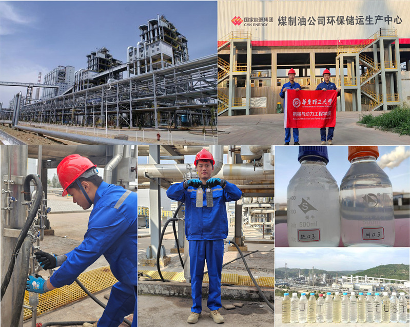 实践团成员还前往内蒙古鄂尔多斯,深入调研国家能源集团鄂尔多斯煤制油分公司。作为行业的领跑者,该企业成功运营着世界上首套百万吨级煤直接液化商业化工厂。实践团在现场调研了煤制油公用工程装置中总设计处理能力为2200 t/h的凝结水处理系统,发现上游潜在污染凝结水会携带油、蜡等物质,使得大量油从潜在污染凝结水系统进入凝结水系统,造成凝结水回收系统瘫痪。同时,由于上游的费托汽包排污管控不到位,导致去凝结水处理系统凝液中SiO2质量浓度超标,影响凝结水的达标排放。通过与技术人员的交流,针对凝结水中油蜡状物质与粉末状SiO2并存的现状,团队成员充分研究后提出了异质颗粒微通道聚结-新型电絮凝强化分离的凝结水处理工艺,以实现凝结水中多形态污染物的深度分离。实践团进一步开展现场侧线实验,采集处理前后的水样进行测试分析,初步论证了工艺路线的可行性。