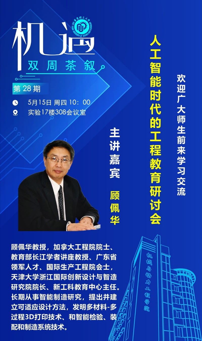 顾佩华教授,加拿大工程院院士、教育部长江学者讲座教授、广东省领军人才、国际生产工程院会士,天津大学浙江国际创新设计与智造研究院经理、新工科教育中心主任。长期从事智能制造研究,提出并建立可适应设计方法,发明多材料-多过程3D打印技术、智能检验、装配和制造系统技术,是Frontiers of Mechanical Engineering、Chinese Journal of Mechanical Engineering、工程设计学报、Robotics and Computer Integrated Manufacturing、Current Engineering Research and Application 等多个学术期刊编委。